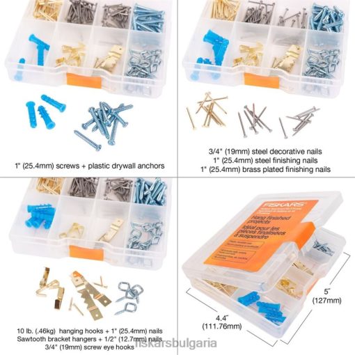 fiskars комплектът от асортименти от крепежни елементи се предлага със 170 части, включително разнообразие от пирони, винтове и куки за закрепване и окачване на проекти направи си сам, както и пластмасов калъф за многократна употреба за съхранение.